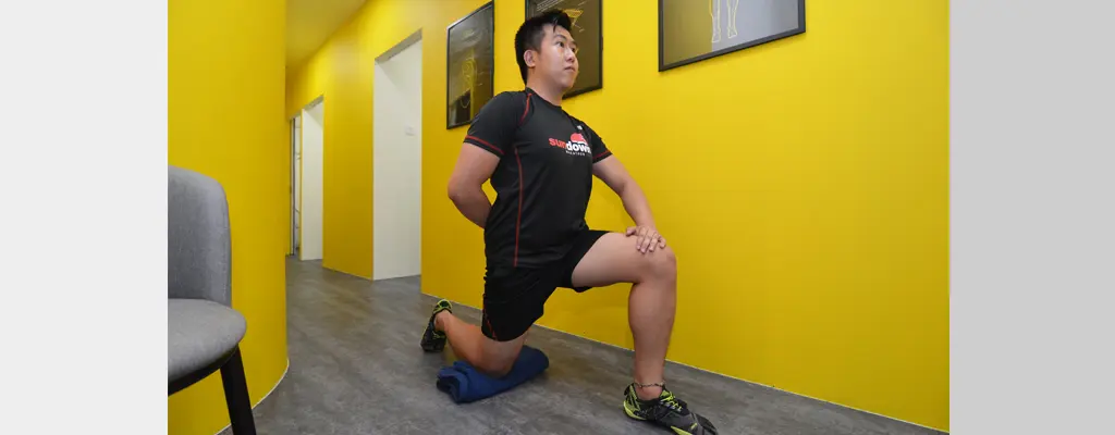 • With a cushion/padding under your right knee, lunge forward with the left leg while keeping the right knee bent and placed in the cushion. Be sure not to let the left knee go past the foot.