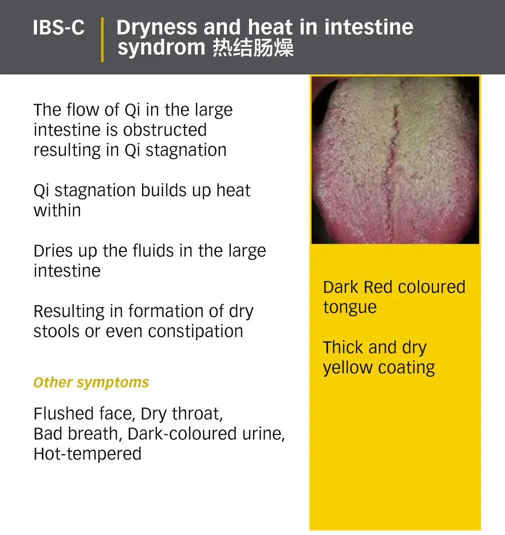 IBS is classified into 2 main subtypes, including IBS with diarrhea (IBS-D) and IBS with constipation (IBS-C). According to TCM Zang Fu theory, IBS-D correlates to the Liver depression and spleen deficiency syndrome (肝郁脾虚) while IBS-C is due to Dryness and heat in intestine syndrome (热结肠燥).